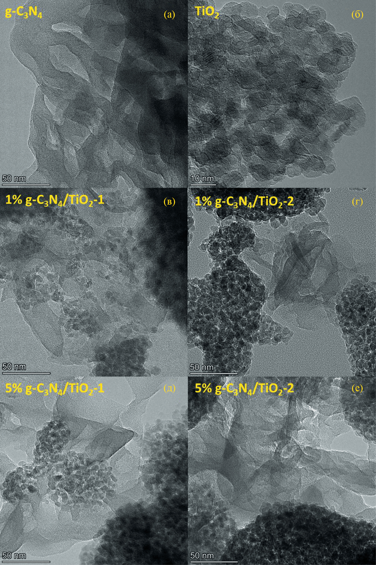 Морфология синтезированных образцов была изучена методом ПЭМ ВР (рис. 3). Структура g-C3N4 и TiO2 не изменяется при синтезе композитных образцов g-C3N4/TiO2: частицы TiO2 размером 5–10 нм распределены по пластинам g-C3N4.
