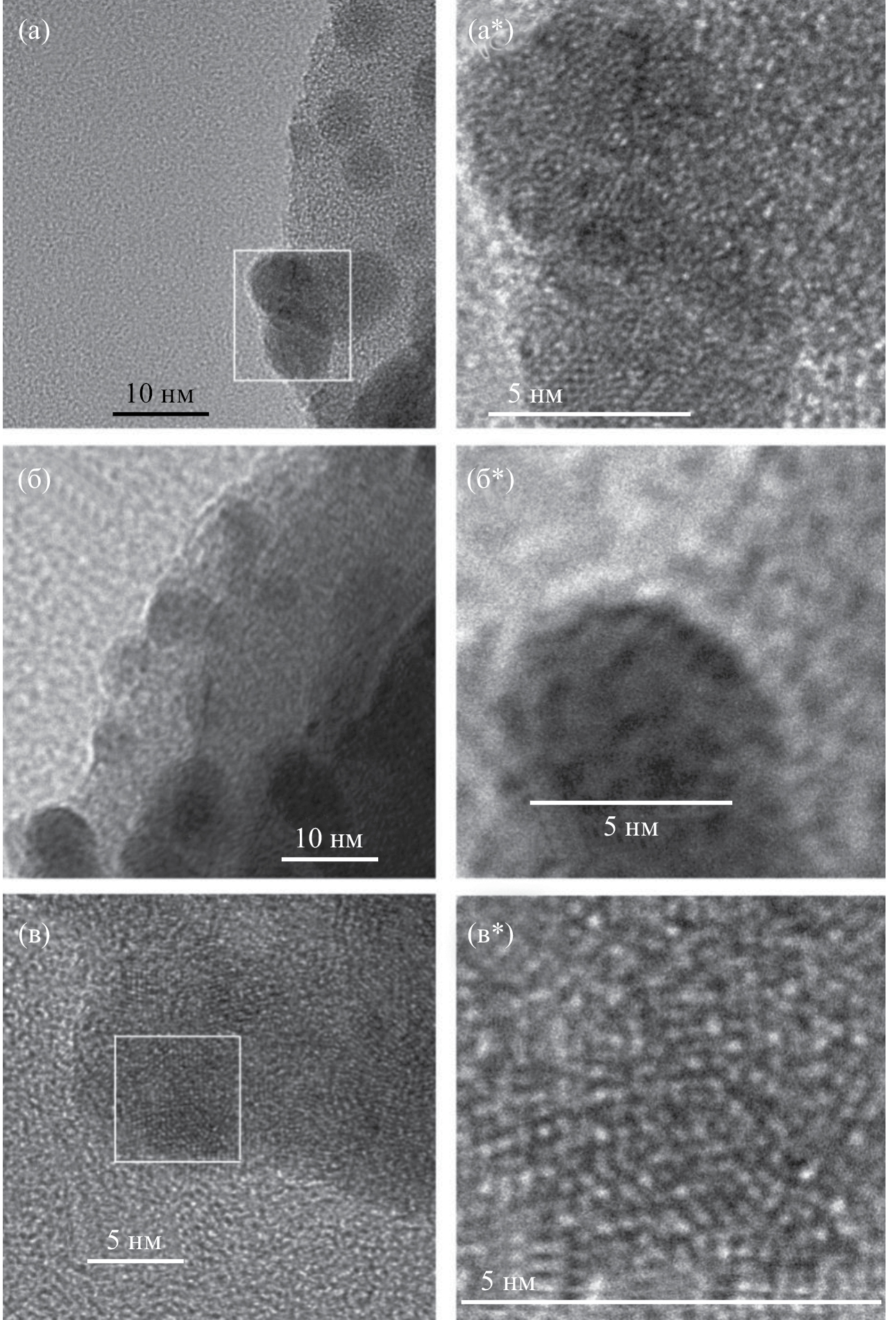 Данные РФА согласуются с результатами исследования катализаторов методом просвечивающей электронной микроскопии высокого разрешения (ПЭМ ВР). На снимках ПЭМ ВР область упорядочения в Pd–P-частицах не превышала 2.0 нм для Pd–0.3Р/HZSM-5(ДМФА) и 0.7 нм для Pd–0.3Р/HZSM-5(толуол) (рис. 4). На снимках ПЭМ ВР образца Pd–1.0Р/HZSM-5(толуол) вообще сложно выделить области упорядочивания.