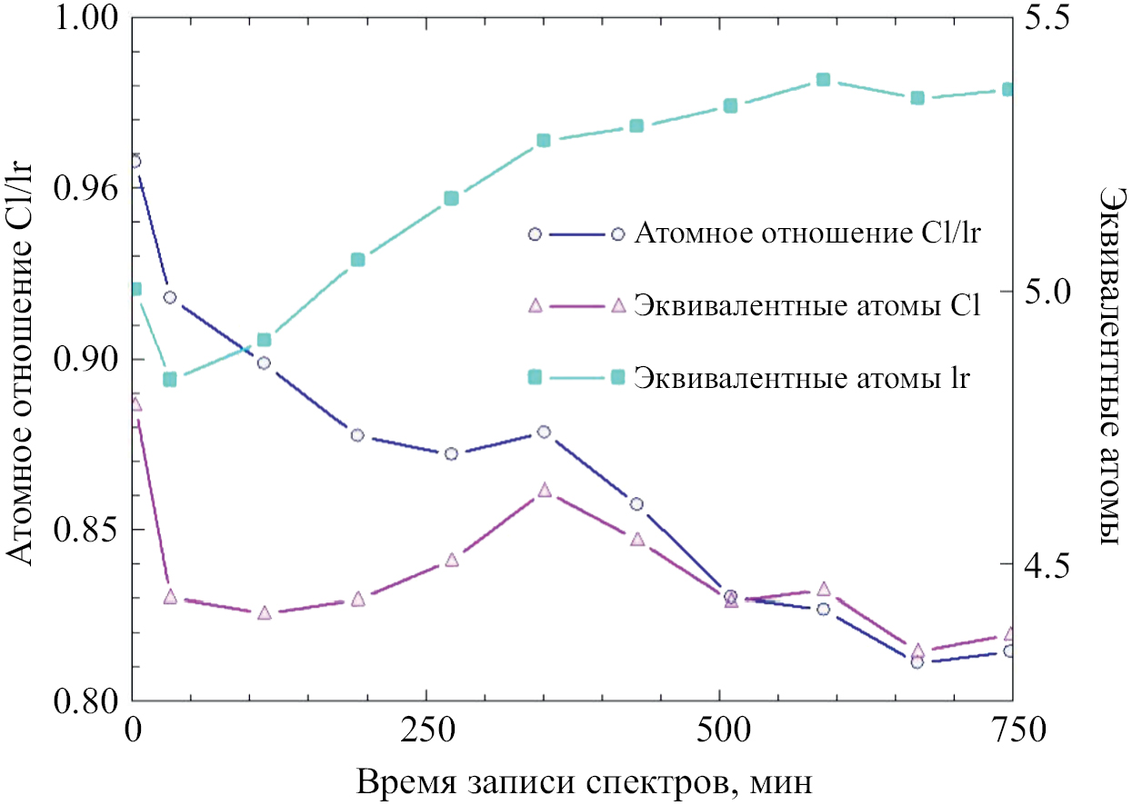 По данным РФЭС, продолжительное воздействие рентгеновским пучком приводит падению интенсивности сигнала Cl2p и уменьшению рассчитанного отношения Cl/Ir на 13.5%. С использованием описанного выше подхода в пакете программ QUASES-IMFP-TPP2M были выполнены расчеты вклада хлора из верхнего слоя кристаллического комплекса в общую интенсивность сигнала Cl2p. Оказалось, что зафиксированное в эксперименте снижение интенсивности сигнала Cl2p отвечает удалению ровно половины (50.2%) атомов хлора из верхнего слоя. Таким образом, по крайней мере в условиях СВВ (парциальное давление водорода ~1 × 10–9 мбар, температура образца ~50°C), в устойчивой форме комплекса атомное соотношение Ir/Cl = 2. Поэтому в дальнейшем атомное отношение Ir/Cl (и Me/Cl в целом) определяли из спектров, записанных в режиме “быстрой регистрации” с энергией пропускания HV = 50 эВ в течение 5–10 мин после включения рентгеновского источника перед записью прецизионных линий (HV = 10 эВ, полная ширина на полувысоте пика Au4f7/2 – 0.93 эВ) продолжительностью 60–90 мин.