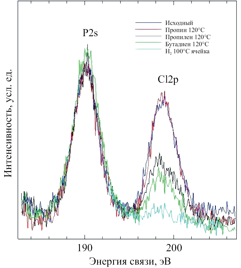 Закрепление биядерного комплекса [M(COD)Cl]2 на поверхности модифицированного оксидного носителя через координацию атома М к линкеру подразумевает формирование субмонослойного покрытия. При этом можно ожидать иммобилизации комплекса как с сохранением димера и координацией либо через один, либо через оба атома металла, так и с разрушением димера и с независимой координацией моноядерных комплексов [M(COD)Cl]. При этом в обоих случаях стехиометрическое соотношение металла к хлору, выполняющему функцию противоиона для M+, должно быть как в исходном комплексе – 1 : 1. Тогда атомное отношение M/Cl прямо указывает на сохранность комплекса или его разрушение по сравнению с исходным образцом. На рис. 3 показаны в сравнении районы P2s + Cl2p спектров образца Rh–P в зависимости от условий реакции и после восстановления в ячейке, зарегистрированных в режиме быстрой записи для минимизации воздействия рентгена на образец.