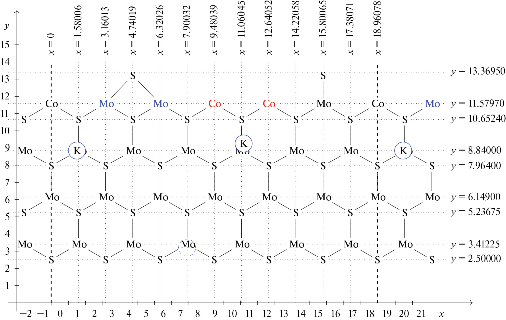 Исходя из этих требований, модельная ячейка построена следующим образом. Лента дисульфида молибдена из четырех рядов атомов вписана в ячейку размером 18.06 × 25.0 × 12.6 Å (6 атомов металла вдоль ребра). Моделировалось M-ребро. Атомы двух рядов, удаленных от М-ребра, были зафиксированы. Положение остальных атомов оптимизировалось. На ребре построен модельный центр из двух атомов молибдена и двух атомов кобальта (рис. 1, 2). Пара атомов молибдена содержит “качающийся” сульфидный мостик, и с его стороны для изоляции активного центра от его образа в “соседней” суперячейке был поставлен дополнительный атом кобальта. Для изоляции со стороны пары атомов кобальта использовался атом молибдена с терминальным сульфидом. Атомы молибдена и серы с y < 7 были зафиксированы, остальные атомы “отпущены”. Внесенные дополнительные атомы калия на боковой поверхности находятся в виде катионов, а новая электронная плотность находится на модельной ленте и концентрируется на активном центре [8]. Ионы калия связаны с модельной лентой ненаправленными кулоновскими силами и могут мигрировать в сторону отрицательного заряда. На рис. 1, 2 показано “стартовое” положение атомов металла и серы и “равновесное” положение атомов калия.