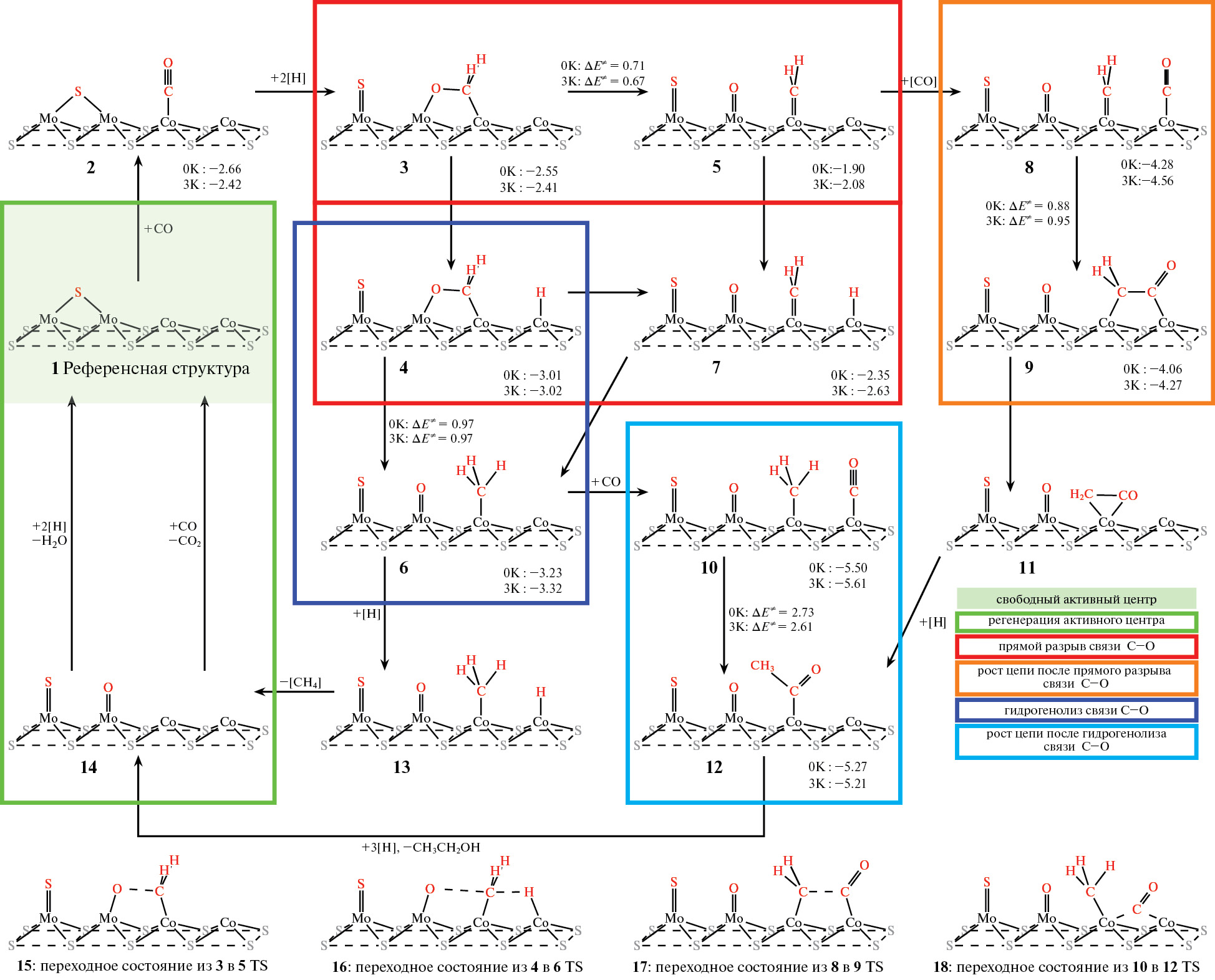 Рис. 4. Упрощенная схема сети реакций в синтезе этанола. Под структурами приведена энергия структуры относительно референсной структуры 1 и молекул CO и H2. Для ключевых стадий даны энергии активации (ΔЕ#). Значения энергии (эВ) приведены для структур с калием (3К) и без калия (0К)