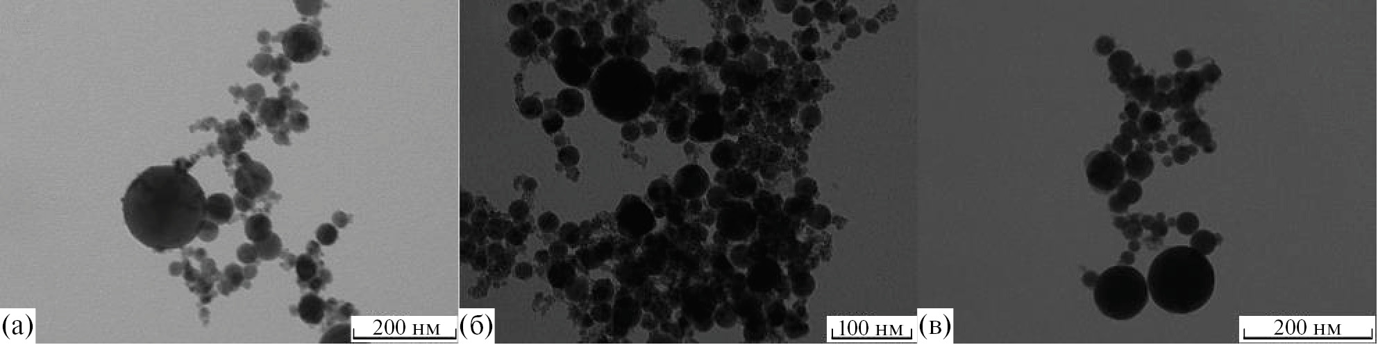 На рис. 2 представлены типичные снимки ПЭМ коллоидных частиц, образовавшихся при ИЛА в этиловом спирте. Все образцы характеризуются сферической формой частиц, что характерно для частиц благородных металлов, получаемых ИЛА в жидкостях [9, 13, 14], а также частиц меди, формирующихся при ИЛА в этаноле [8, 12]. Размер частиц во всех случаях варьируется в пределах 5–100 нм.