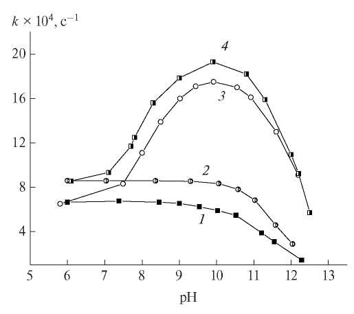 Рис. 7. рН-Зависимости констант скорости окисления Et2S при температуре 25°С пероксидом водорода (1); пероксоборатом (0.015 моль/л) (3) и в системах Н2О2 (0.03 моль/л)– –NaНСО3 (0.06 моль/л) (2); ПБ (0.015 моль/л)–NaНСО3 (0.006 моль/л) (4) [22].