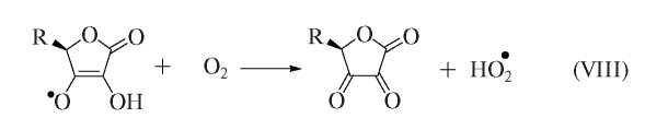 Согласно литературным данным, значение f для аскорбиновой кислоты составляет 0.6 [11]. Это объясняется тем, что образующийся из аскорбиновой кислоты радикал окисляется кислородом (реакция VIII). Эта реакция дает гиропероксильный радикал, который участвует в продолжении цепи окисления [20]. В результате снижается параметр f.