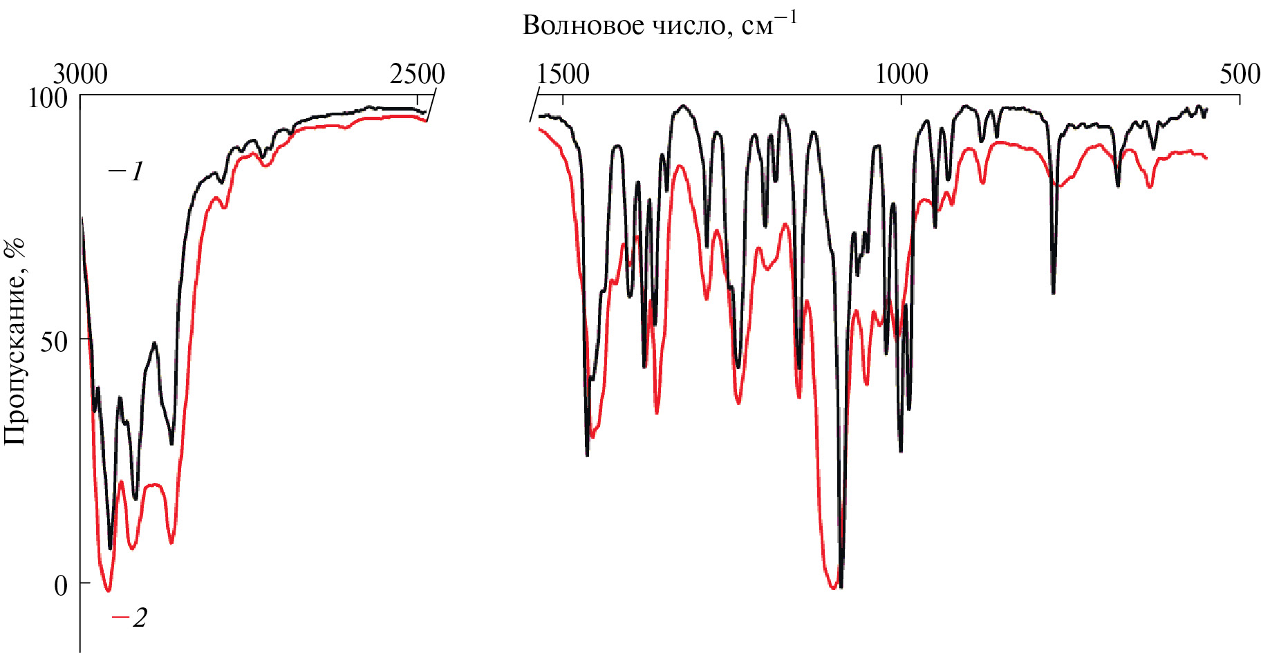 Рис. 3. ИК-спектры: 1 – комплекса IVb (таблетка, KBr), 2 – свободного лиганда IVa (тонкая пленка, KBr).