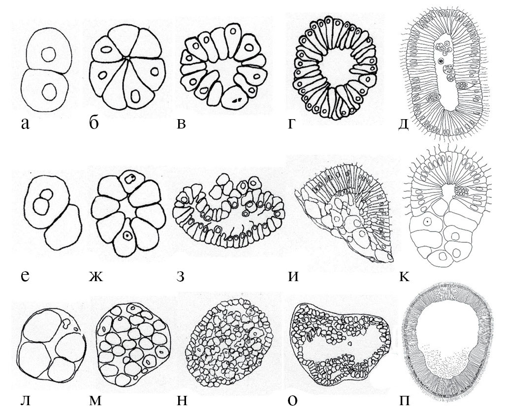 Рис. 2. Эмбриональное развитие однослойных (бластульных) личинок губок. а-д – эмбриональное развитие известковой губки Ascandra minchini (Calcarea, Calcinea) и личинка – кальцибластула Leucosolenia (?) laxa (Calcarea, Calcinea) (по материалам статей: Borojevic, 1969; Amano, Hori, 1993. Рисунки а-г из: Гонобоблева, 2009). Полное равномерное дробление (а, б) завершается формированием однослойной целобластулы (в, г). Радиальные плоскости делений клеток зародыша сохраняются до конца эмбриогенеза, что приводит к формированию однослойной личинки (д). В полости личинки присутствуют гранулярные амебоциты материнского происхождения. В задней полусфере, среди жгутиковых клеток, локализованы предположительно светочувствительные клетки (д). е–к – эмбриональное развитие и личинка – амфибластула известковой губки Sycon sp (Calcarea, Calcaronea) (по материалам статей: Franzen, 1988; Amano, Hori, 2001; рисунки е-и из: Гонобоблева, 2009). Полное дробление приводит к формированию ~ 64 кл. целобластулы (ж). Радиальные плоскости делений и процессы дифференцировки приводят к формированию стомобластулы (з). Передний полюс стомобластулы образован ресничными клетками, апикальная часть которых обращена в полость зародыша, а задний полюс состоит из крупных зернистых клеток. После выворачивания (экскурвации) стомобластулы образуется личинка – амфибластула (и, к). л-п – эмбриональное развитие и личинка – цинктобластула Oscarella tuberculata (Homoscleromorpha) (по материалам статей: Ereskovsky, Boury-Esnault, 2002; Boury-Esnault et al, 2003; рисунки л-о из: Гонобоблева, 2009).Полное, не вполне равномерное, анархическое дробление (л) приводит к формированию морулы (м). В результате эпителизации, охватывающей все клетки зародыша (н, о), формируется однослойная личинка – цинктобластула. В полости личинки находятся симбиотические бактерии (п).