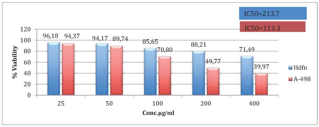 Fig. 1. Percentage of live cells A-498 and Hdfn cell line treated with biosynthesized selenium nanoparticles