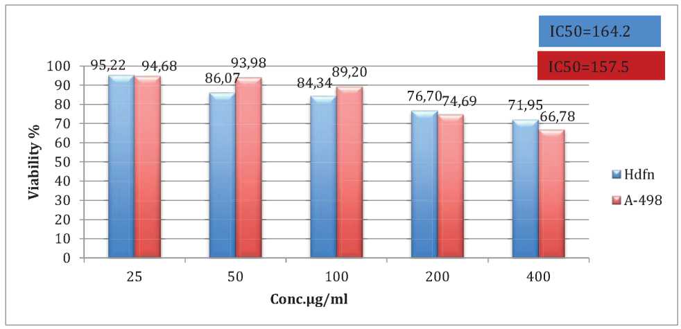 Meanwhile, the effect of commercial SeNPs on the cancer cell line A-498 and the normal cell line Hdfn was small at the first four concentrations (25, 50, 100, 200 µg/ml), and the percentage of effect increased at the concentration of (400 µg/ml), as the percentage of live cancer cells (66.7 %), while the percentage of live normal cells was (71.9 %), as shown in fig. 2.
