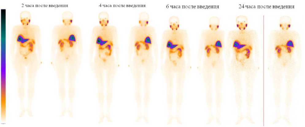 Радионуклидное исследование проводилось на гамма-камере Symbia Intevo Bold (Siemens) в режиме Wholebody через 2, 4, 6 и 24 ч. после внутривенного введения РФЛП со скоростью сканирования 12 см/мин, матрицей 1024 × 256 пикселей. Для регистрации изображений использовали низкоэнергетический коллиматор высокого разрешения. Мультимодальное исследование в объеме однофотонной эмиссионной компьютерной томографии, совмещенной с КТ (ОФЭКТ/КТ) для оценки первоначальной функциональной пригодности РФЛП выполнялось только на одной временной точке — 2 ч. после введения индикатора. Для сбора изображений с помощью ОФЭКТ использовались следующие параметры: 60 проекций по 20 с. каждая, матрица — 256 × 256 пикселей.