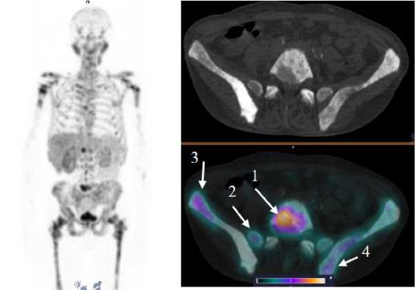 Fig. 5. MIP reconstruction, CT and SPECT/CT image of a patient with prostate cancer with multiple metastases to bones and pelvic lymph nodes 2 hours after injection of [99mTc]Tc-HYNIC-PSMA. Аccumulation of radiopharmaceutical in the pathological areas is indicated by the arrow on the SPECT-CT image: inguinal lymph node on the left (1) SUVmax 22; femur on the left (2) SUVmax 53; pubic bone on the left (3) SUVmax 22.8