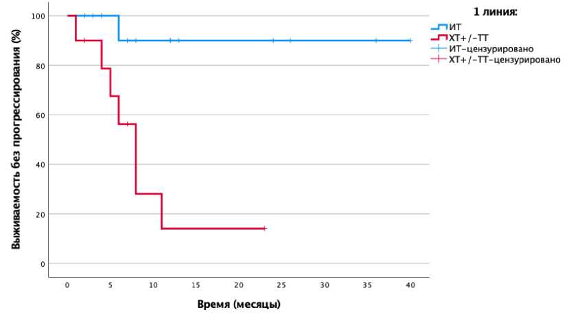 При наличии первично-метастатического процесса или при прогрессировании заболевания, те пациенты, которым была назначена в рамках 1 линии лечения иммунотерапия (n = 14/21), имели значимое преимущество по выживаемости без прогрессирования (ВБП) (р = 0,002) (рис. 1).