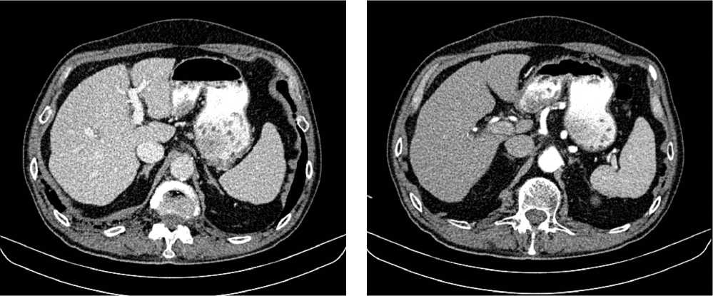 Рис. 4. Частичный регресс по данным компьютерной томографии органов брюшной полости на фоне иммунотерапии пембролизумабом у пациента 81 года с диагнозом метастатический рак желудка с признаками микросателлитной нестабильности (декабрь 2021 г.; выживаемость без прогрессирования составила 25+ мес.)