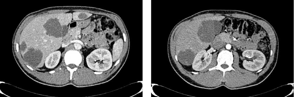 Рис. 9. Частичный регресс, по данным компьютерной томографии органов брюшной полости, на фоне иммунотерапии пембролизумабом у пациента 38 лет с диагнозом метастатический колоректальный рак с признаками микросателлитной нестабильности (сентябрь 2023 г.)