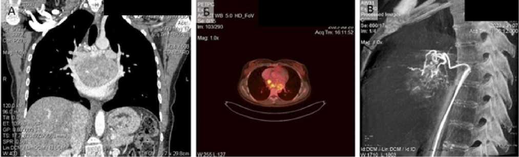 Рис. 1. Результаты рентгенологических методов исследования: А — КТА-ОГК; Б — ФДГ ПЭТ-КТ; В — Селективная ангиография