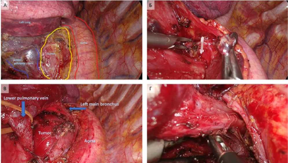 Fig. 2. Stages of the 1st stage of surgical treatment (left VATS): A — type of tumor; Б - clipping of the left bronchial artery; B — mobilization of the left pulmonary veins; Г — mobilization of the left main bronchus