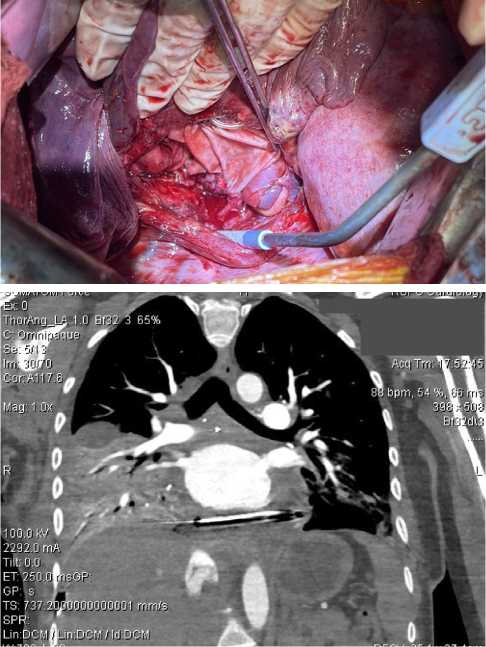 5. Рис. 4. Вид после завершения реконструкции предсердия бычьим перикардом: А — интраоперационное фото; Б — КТА-ОГК после операции