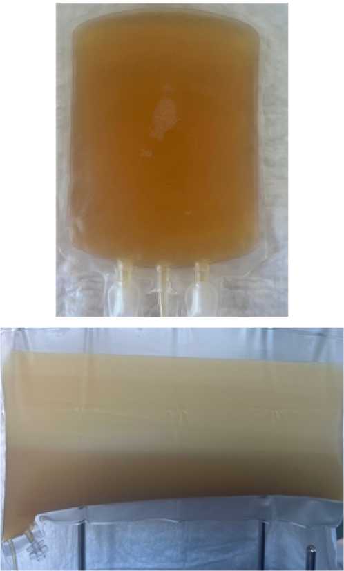 С целью быстрой коррекции содержания ГТ были проведены две процедуры плазмообмена (ПО) с интервалом 48 ч. на аппарате Spectra Optia (BCT Terumo, США). За каждую процедуру ПО удалялось 3 800 мл плазмы пациента (1,4 ОЦП) с адекватным возмещением объема свежезамороженной плазмой и 5 % раствором альбумина (в соотношении 55 % и 45 % соответственно) (вид донорской плазмы перед ПО и вид плазмы, удаленной в процессе процедуры плазмообмена у пациента № 2 представлены на рис. 2 и рис. 3). После первой процедуры ПО уровень ТГ снизился до 2,50 ммодь/л. На следующий день концентрация ТГ повысилась до 11,6 ммоль/л. После повторного ПО уровень ТГ снизился до 2,02 ммоль /л и в последующем существенно не повышался. Побочные реакции в течение аферезных процедур на отмечались.