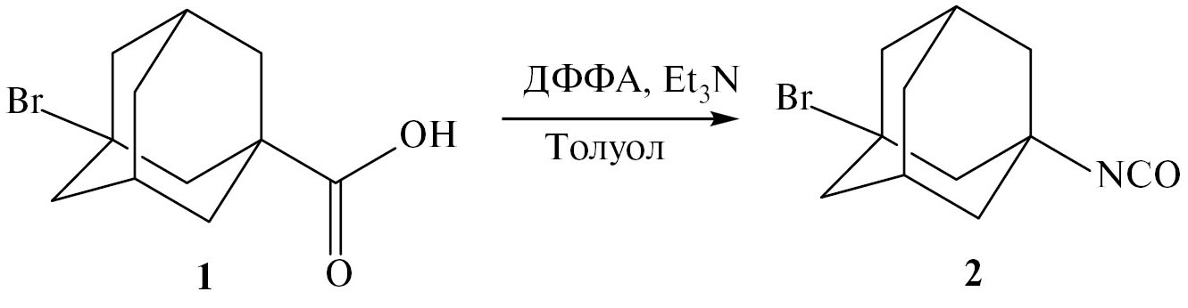 3-Бромадантилизоцианат (2) получали one pot методом действием на 3-бромадамантилкарбоновую кислоту (1) эквимолярным количеством дифенилфосфорилазида (ДФФА) и триэтиламина в среде толуола (схема 1).