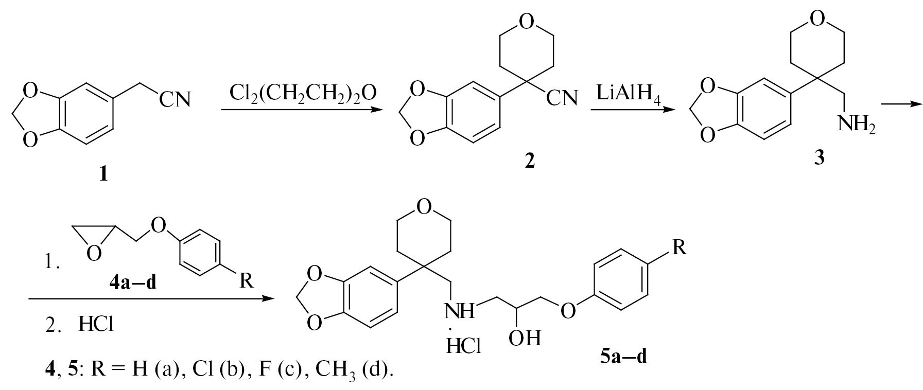 В качестве исходного продукта нами использован 2-(бензо[d][1, 3]диоксол-6-ил)ацетонитрил (1). Последний конденсацией с 2,2’-дихлордиэтиловым эфиром в среде диметилформамида в присутствии едкого натра и при температурном режиме 70–75°С с выходом 65% переведен в соответствующий 4-(бензо[d][1, 3]диоксол-6-ил)-тетрагидро-2H-пиран-4-кабонитрил (2), восстановлением которого алюмогидридом лития выделен ключевой (4-(бензо[d][1, 3]диоксол-6-ил)-тетрагидро-2H-пиран-4-ил)метиламин (3). Реакцией последнего как с 2-(феноксиметил)оксираном (4а), так и с замещенными в пара-положении ароматического кольца арилоксиметилоксиранами 4b–d в среде изопропилового спирта и каталитических количеств воды синтезированы целевые арилоксиаминопропанолы, действием эфирного раствора хлористого водорода переведенные в соответствующие гидрохлориды 5а–d (схема 1).