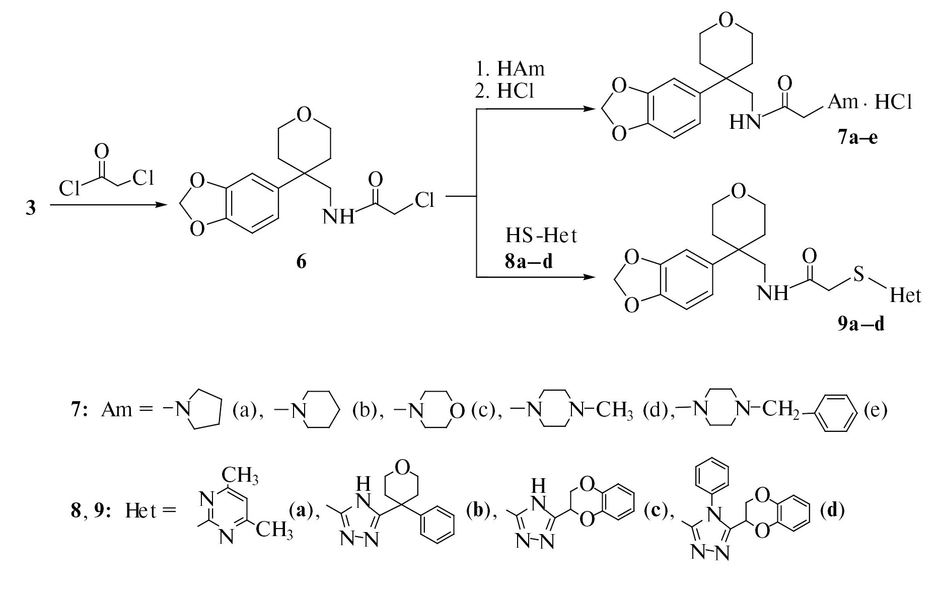Для синтеза амино- и сульфанилацетильных производных проведено ацилирование амина 3 хлорангидридом хлоруксусной кислоты, в результате которого с выходом 73% выделен N-((4-(бензо[d][1, 3]диоксол-6-ил)тетрагидро-2H-пиран-4-ил)метил)-2-хлорацетамид (6). Конденсацией последнего с гетероциклическими аминами (пирролидин, пиперидин, морфолин, N-метил- и N-бензилпиперазины) в смеси диоксана и этилового спирта (10 : 1) в присутствии каталитических количеств KI синтезирован ряд аминоацетамидов 7а–e, охарактеризованных в виде гидрохлоридов. Реакцией того же хлорамида 6 с замещенными пиримидин- и триазолтиолами 8а–d в спиртовой среде в присутствии KOH получены соответствующие гетерилсульфанилзамещенные производные 9а–d (схема 2).