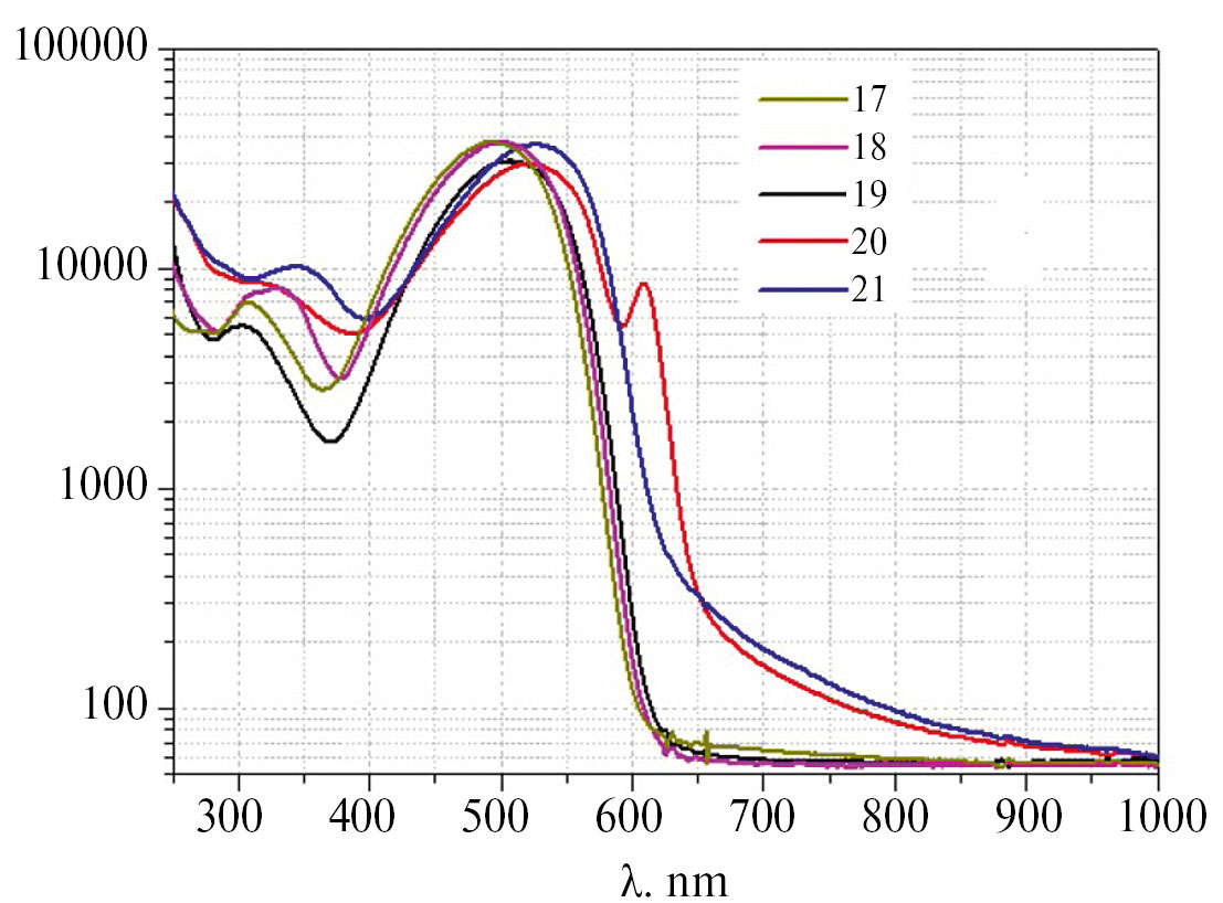 Рис. 3. ЭСП 5-(метилтио)тиофениленсодержащих красителей 17–21 в хлороформе (основной переход)