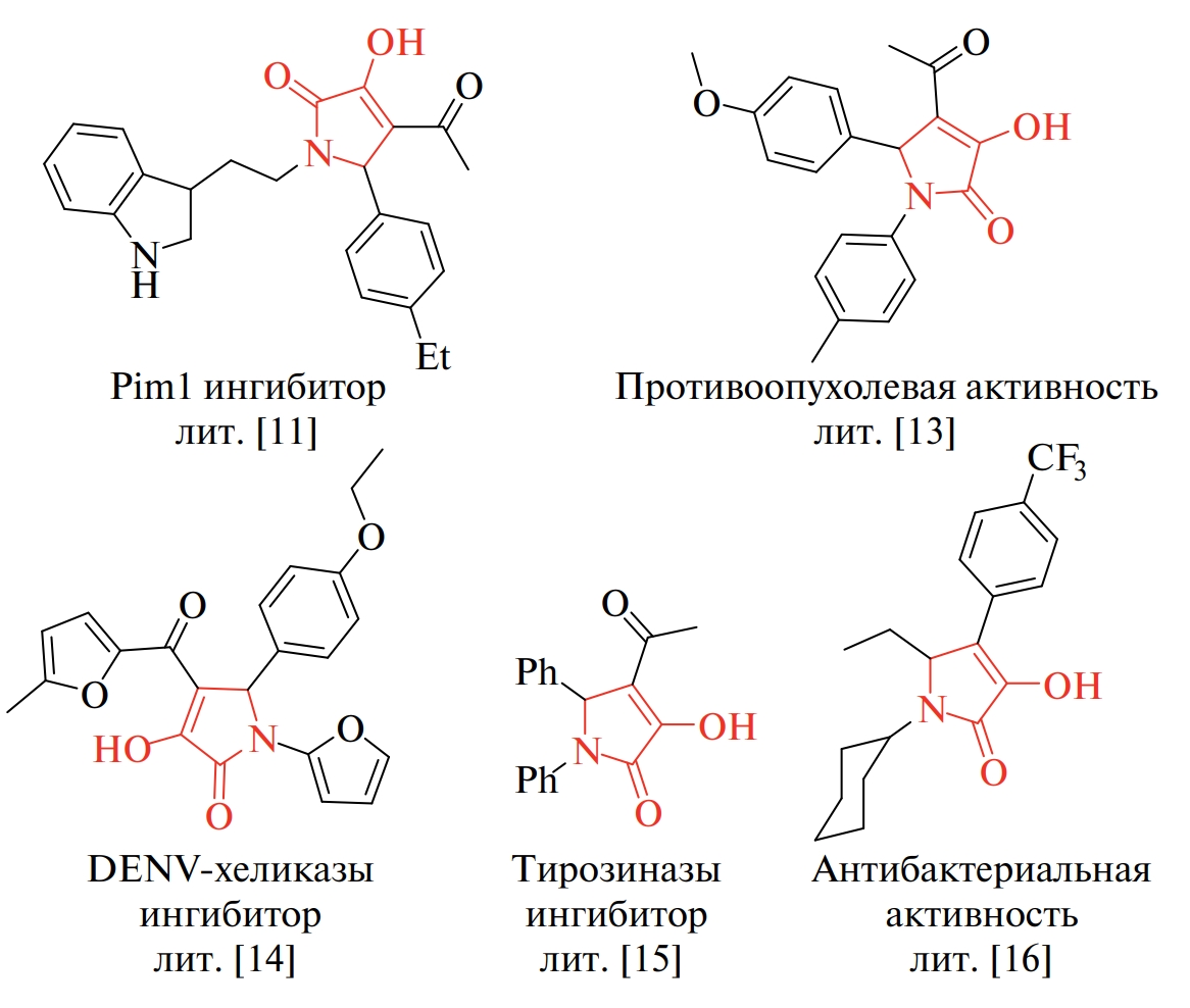 Соединения с пиррол-2-оновым каркасом обладают широким фармакологическим профилем [1]. Биологически активные пиррол-2-оны могут иметь как природное (леополиевая кислота А [2], клаузенамид [3], фенопиррозин [4], 2-гидроксифенопиррозин [5]) (рис. 1), так и синтетическое происхождение (рис. 2) [1, 6–10]. Среди производных пиррол-2-онов можно выделить 3-гидроксизамещенные 1,5-дигидро-2Н-пиррол-2-оны, которые обладают антипролиферативной [11, 12]) и противоопухолевой [13] активностью, ингибирующими свойствами в отношении DENV-хеликазы [14] и тирозиназы [15], антибактериальной активностью (рис. 2) [16].