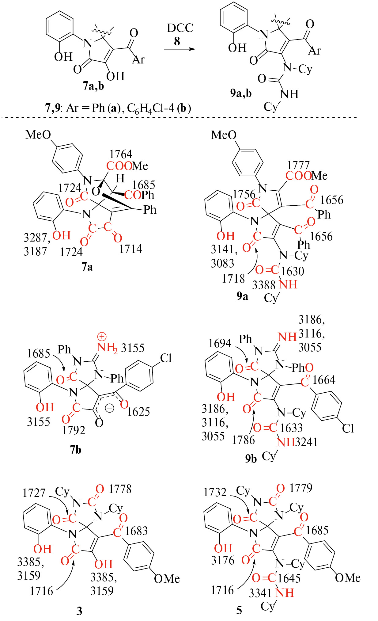 Установлено, что подход, предложенный ранее [17], имеет ограничения для синтеза некоторых 5-спирозамещенных 3-амино-1,5-дигидро-2Н-пиррол-2-онов, а реакции термолиза протекают неселективно в случае использования исходных продуктов типа метил 1-(2-гидроксифенил)-4,9-дибензоил-7-(4-метоксифенил)-2,6-диоксо-3-(1,3-дициклогексилуреидо)-1,7-диазоспиро[4.4]нона-3,8-диен-8-карбоксилата (9а) и 1-(6-(2-гидроксифенил)-2-имино-4,7-диоксо-1,3-дифенил-9-(4-хлорбензоил)-1,3,6-триазаспиро[4.4]нон-8-ен-8-ил)-1,3-дициклогексилмочевины (9b), в структуре которых есть замещенные пиррольный (продукт 9a) и имидазольный (продукт 9b) циклы, по-видимому, термически неустойчивые в исследованных условиях.