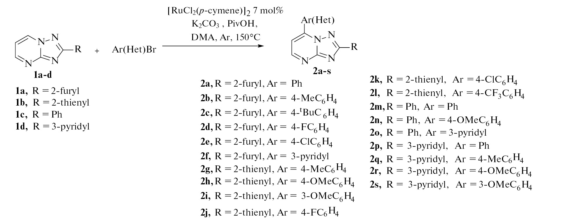 Для С–Н арилирования сложных гетероциклических субстратов часто используют катализ соединениями рутения [33–35]. При этом N-донорный гетероциклический фрагмент молекулы субстрата обычно играет роль направляющей группы, а арильная группа входит в (гетеро)ароматический заместитель [36–39]. Однако арилирование триазолопиримидинов в условиях рутениевого катализа не исследовалось. Мы предположили, что рутениевый катализ мог бы позволить селективно арилировать 2-арил- и 2-гетероарил-[1, 2, 4]триазоло[1,5-a]пиримидины с активацией связи С–Н (гетеро)арильного заместителя в положении 2 триазолопиримидинового бицикла.
