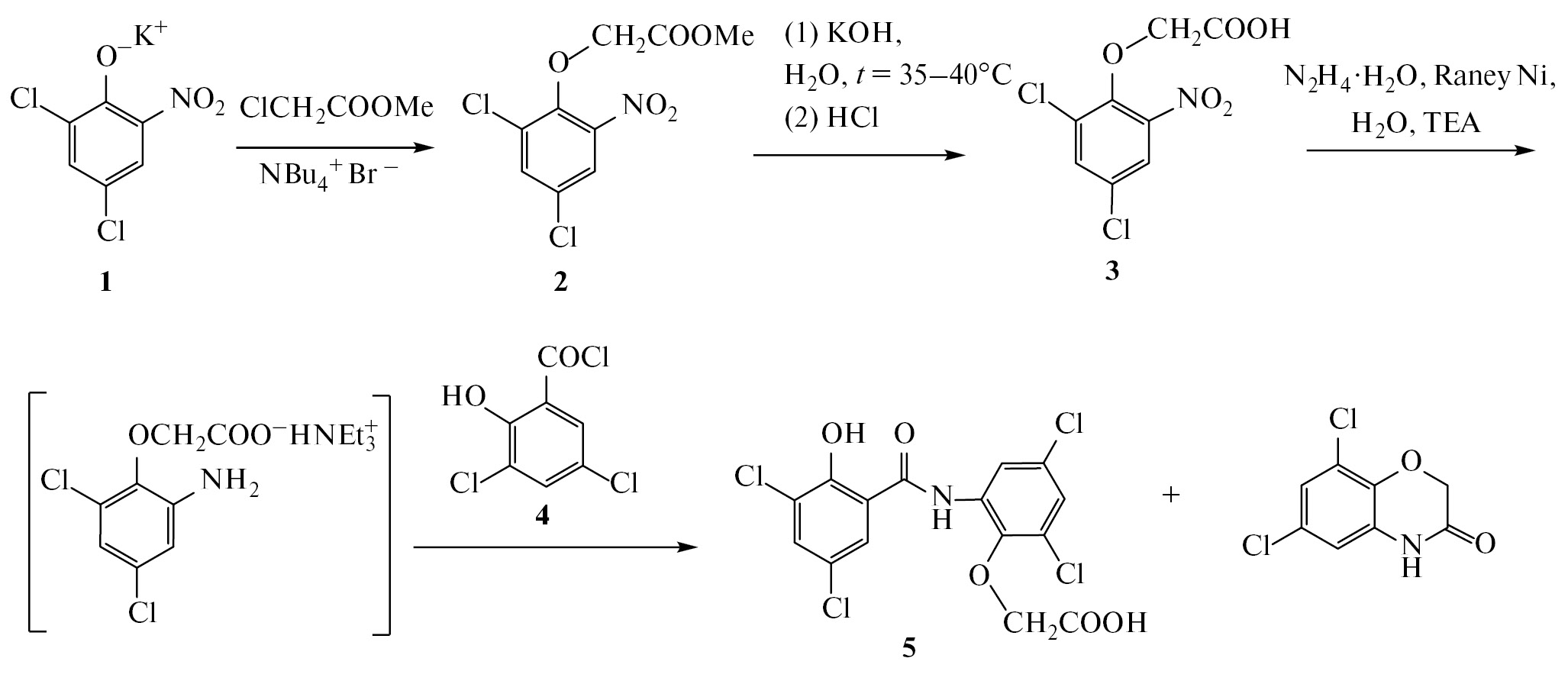 При выборе реагента для восстановления нитрокислоты 3 мы предполагали, что неустойчивая 2-амино-4,6-дихлорфеноксиуксусная кислота будет легко циклизоваться с образованием ранее описанного 6,8-дихлор-2Н-1,4-бензоксазин-3(4Н)-она [12], поэтому восстановление нитрогруппы проводили в щелочной среде. Нитрокислоту 3 растворяли в водном растворе триэтиламина и обрабатывали гидразингидратом с использованием скелетного никелевого катализатора (никеля Ренея) при 45–50˚С (схема 2). После отделения катализатора раствор триэтиламмониевой соли 2-амино-4,6-дихлорфеноксиуксусной кислоты концентрировали в вакууме и использовали для ацилирования 2-гидрокси-3,5-дихлорбензоилхлоридом 4.