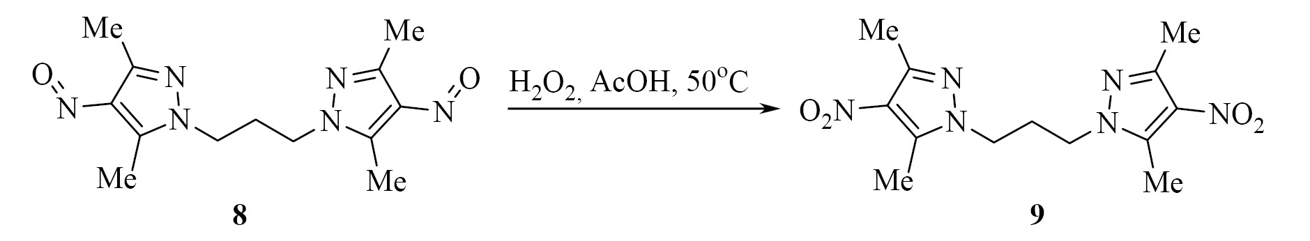 Нитропроизводное 7 получено с выходом 60% при окислении нитрозопиразола 1 пероксидом водорода в уксусной кислоте (схема 1), а окисление в тех же условиях бис(4-нитрозопиразола) 8 (схема 2) [12] привело к соответствующему динитропроизводному 9 c выходом 84%.