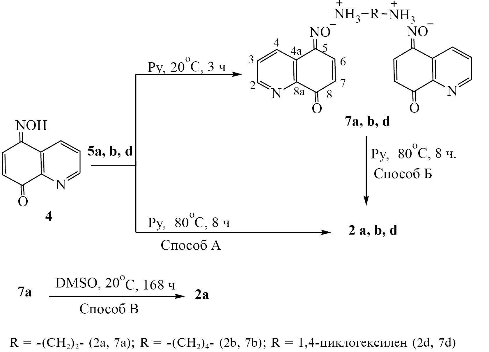 Соединения 1а, c (схема 1) образуются при 20°C в течение 120–144 ч (ТСХ-контроль). Взаимодействие монооксима 3 с диаминами 5b, d и хинолина 4 с диаминами 5а, b, d при 20°C приводит к образованию ранее неизвестных диаммониевых солей 6b, d (схема 1) и 7а, b, d (схема 2), которые формируются в реакционной смеси в виде мелкокристаллических осадков, что препятствует аминированию. Однако нитрозоанилины 1b, d (схема 1) и нитрозохинолинамины 2a, b, d (схема 2) удалось получить при выдерживании смеси монооксима 3 с диаминами 5b, d и хинолина 4 с диаминами 5а, b, d при 80°C в течение 8 ч (способ А).