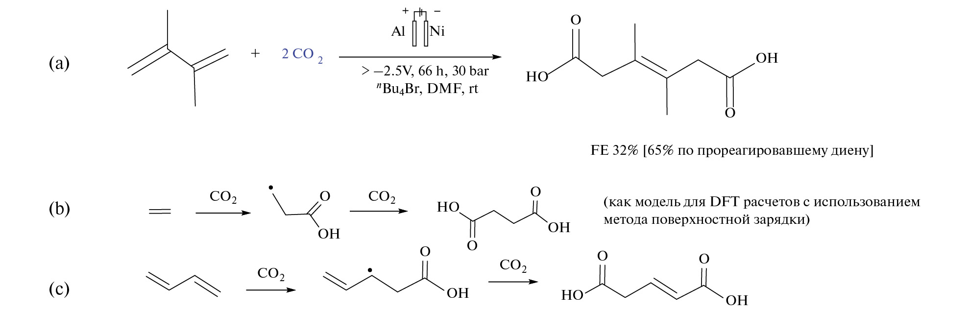 Механизм реакции электрокарбоксилирования бутадиена и этена (который выбран для DFT-моделирования) на катодах-электрокатализаторах из Pt и Ni подробно исследован с целью выбора более активных материалов электродов (схема 5) [41]. Радикалы, обозначенные точками, прочно связаны с поверхностью металла, что тушит спиновую поляризацию. Ni оказался более эффективным для карбоксилирования, и поэтому более подробно изучен. При потенциале у основания волны на циклической вольтамперограмме Eonset = –1.3 В скорость восстановления низкая, и только при –2.5 В реакция протекает легко, поскольку начинает образовываться свободный CO2- радикал. DFT исследование показало, что скорость-лимитирующей стадией является первое карбоксилирование. Побочные продукты реакции зависят от потенциала электрода: муравьиная кислота образуется за счет следов воды при любых потенциалах, а оксалаты – только в результате димеризации свободных радикалов СО2 при высоких потенциалах. Карбонаты и CO являются побочными продуктами при умеренных потенциалах, но их образование подавляется при более высоких потенциалах, поскольку они в основном образуются на поверхности металла, а не через “свободный” CO2 радикал. Энергия активации первой реакции карбоксилирования значительно ниже на Ni(111), чем на Pt(111), что объясняет лучшую каталитическую активность Ni по сравнению с Pt электродом. Кроме того, конкурирующие реакции образования CO и карбоната быстрее на Pt, чем на Ni, поскольку последний в большей степени стабилизирует кислородные интермедиаты. Предполагают, что для разработки улучшенного катализатора необходимо будет снизить энергию активации реакции сочетания C–C и одновременно подавить образование карбонатов. В результате реализовано электрокарбоксилирование 2,3-диметилбутадиена на никелевом катализаторе-катоде (схема 5, а) [41] с умеренными выходами.