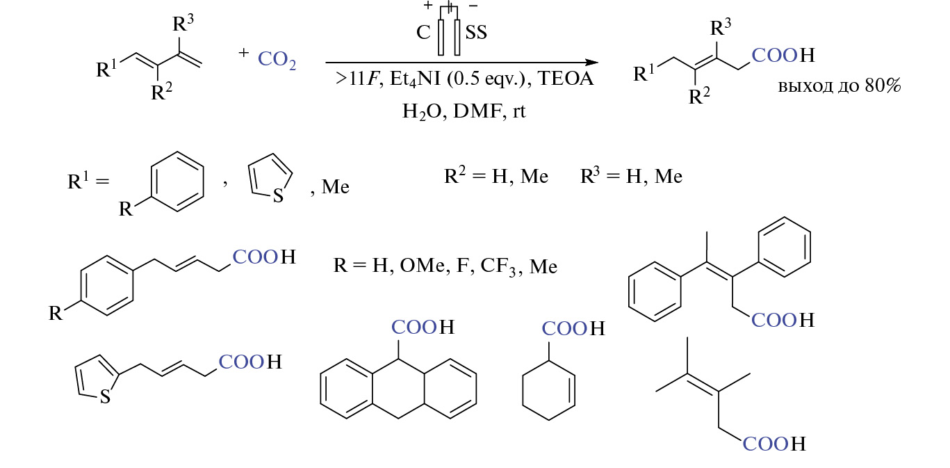 Использование триэтаноламина (TEOA) в качестве источника протонов, ДМФА и Et4NI в электролизе замещенных олефинов в ячейке с углеродными электродами без разделения анодного и катодного пространства позволило реализовать β-монокарбоксилирование (схема 2, с) [38]. В реакцию вступают как терминальные, так и ди- и тризамещенные олефины. Механизм процесса примерно соответствуют предложенному ранее (схема 2, b) [37].