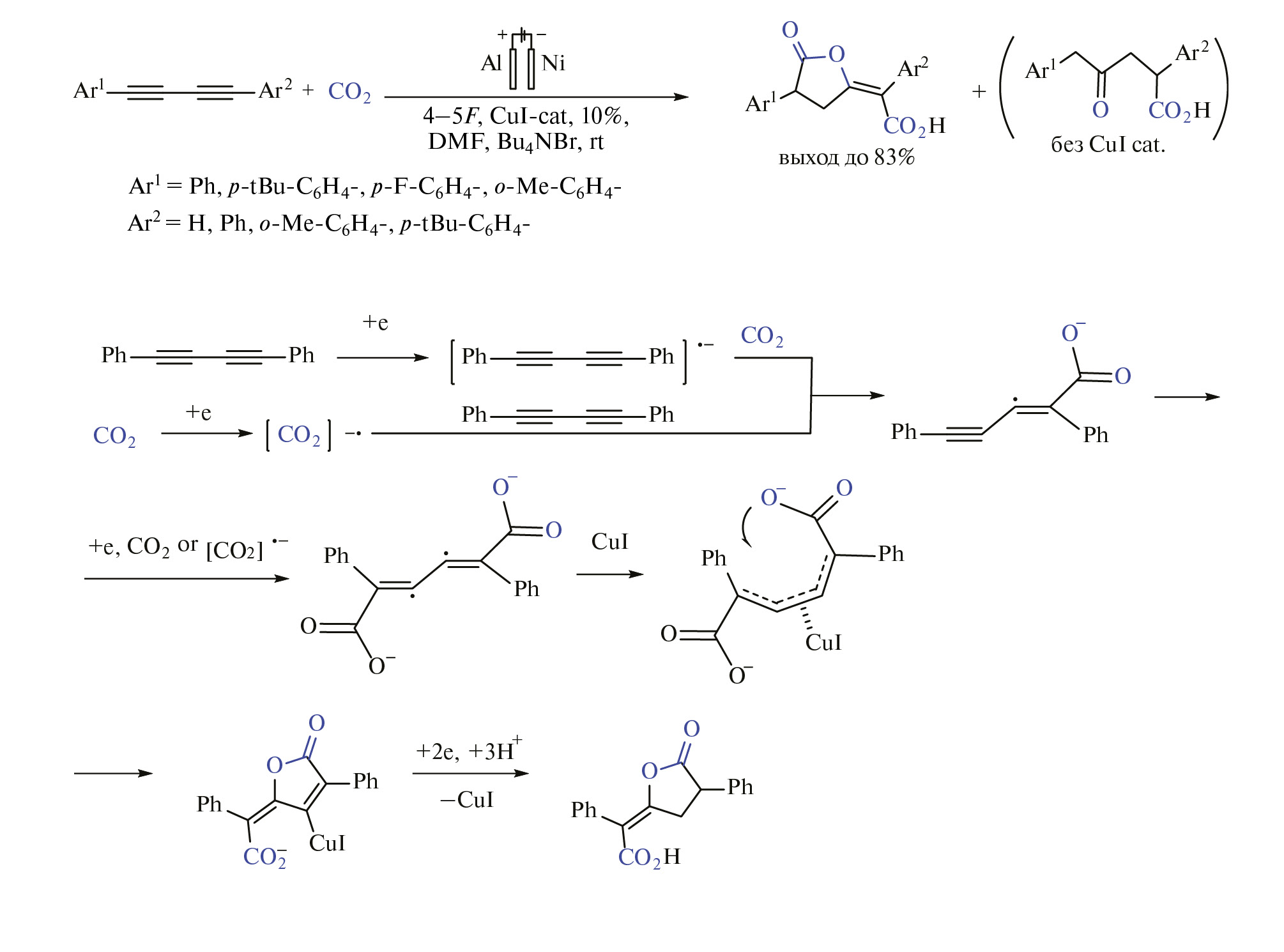 Предложен механизм, согласно которому металлические катализаторы, такие как CuI (другие соли – палладия, железа – работают хуже), могут активировать ненасыщенные связи и способствовать внутримолекулярной циклизации группы COO— в результате координации с дирадикалом 1,3-диена [47, 48]. Эти же идеи были использованы для разработки новой стратегии синтеза алкилиденлактонов из CO2 и 1,4-диарилбута-1,3-диинов методом электрохимического катализа с участием CuI (схема 12) [48]. Основными продуктами реакции являлись алкилиденлактоны или γ-кетокарбоновые кислоты с катализатором CuI или без него соответственно.