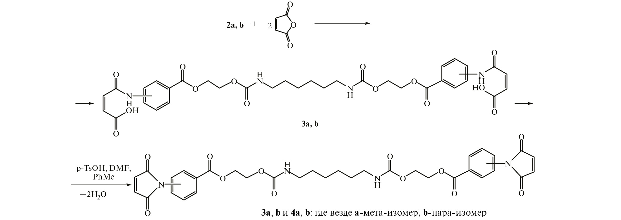 Диамиды 3a,b легко подвергаются внутримолекулярной циклизации при нагревании в присутствии каталитических количеств п-толуолсульфокислоты в среде растворителя, состоящего из смеси ДМФА и толуола, с одновременной азеотропной отгонкой выделяющейся воды. В результате реакции с выходами 91–97% синтезированы бис[2-(3(4)-(2,5-дигидро-2,5-диоксо-1Н-пиррол-1-ил)фенилкарбонилокси)этил]гексан-1,6-диилдикарбаматы 4a,b (схема 2).