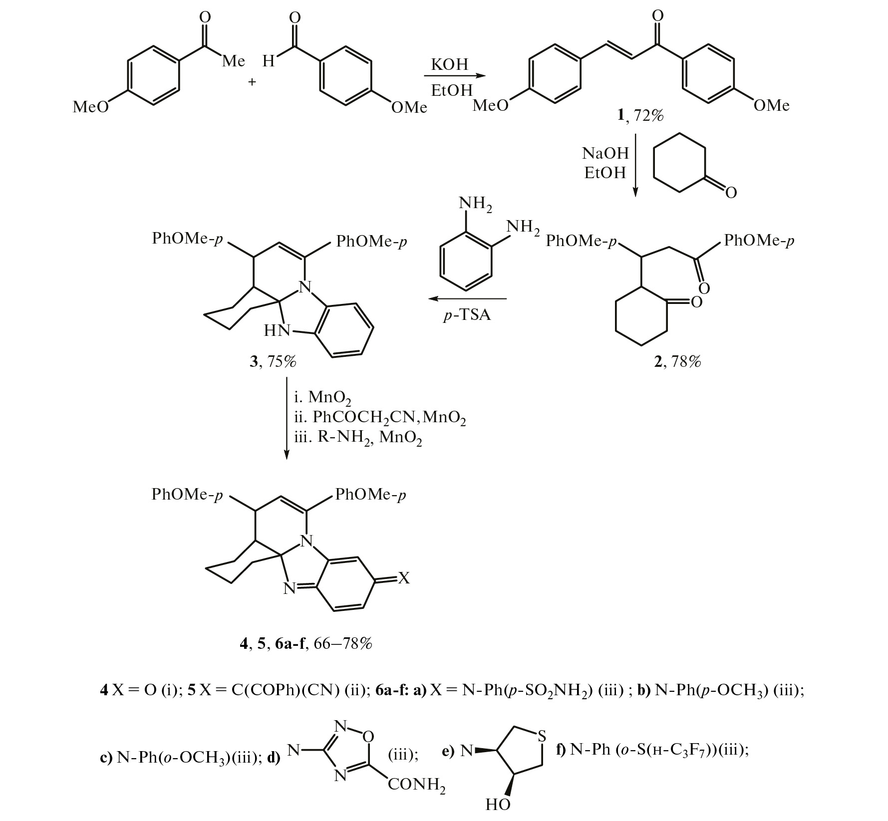 Соединение 1 получали альдольной конденсацией п-метоксиацетофенона с анисовым альдегидом по методике из литературы [7]. На стадии выделения и очистки продукта авторы использовали экстракцию и колоночную флэш-хроматографию, однако если использовать более длительную экспозицию реакционной смеси (72 ч), халкон кристаллизуется с выходом 72%. Дикетон 2 был получен реакцией Михаэля диметоксихалкона 1 и циклогексанона по методике из литературы [8].