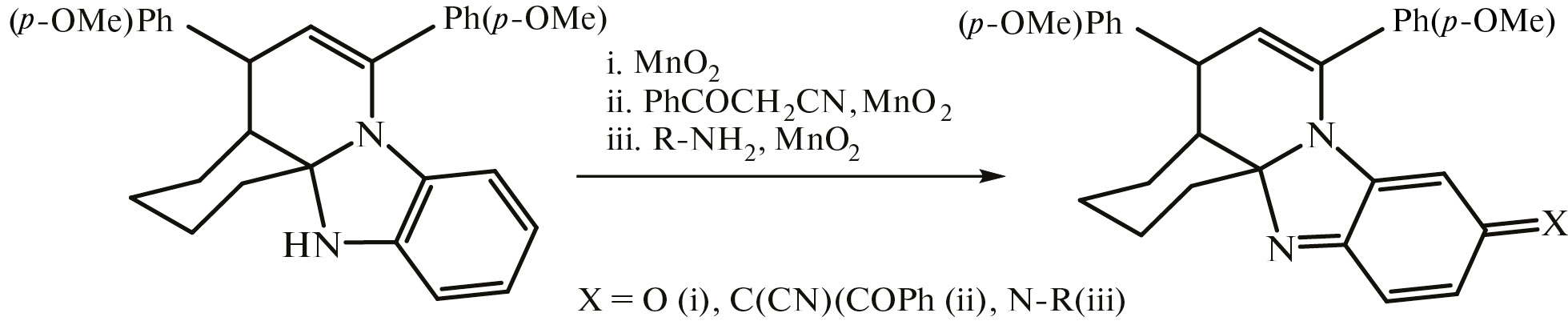 Впервые получен 5,7-бис(4-метоксифенил)-1,2,3,4,4а,5-гексагидро-13Н-бензимидазо[2,1-j]хинолин, относящийся к ряду производных пиридо[1,2-a]бензимидазола. В результате окисления в присутствии MnO2 получен п-хинонмоноимин этого же ряда, окислительное сочетание которого с бензоилацетонитрилом привело к получению не описанных ранее метиленхинониминов; в результате окислительного сочетания с первичными аминами синтезированы соответствующие п-хинондиимины.