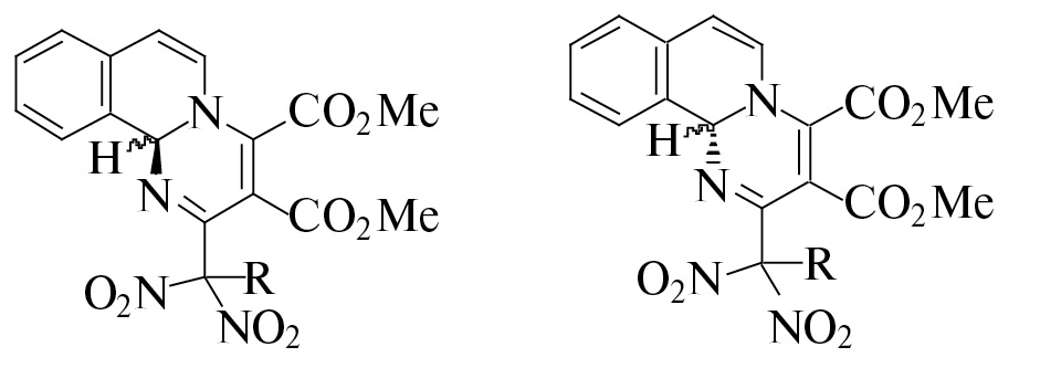 Таким образом, исследованная реакция трехкомпонентной гетероциклизации полинитрометанов 1а–e с изохинолином 2 в присутствии диметилового эфира ацетилендикарбоновой кислоты 3 в результате реализации “one pot” процесса позволяет получать труднодоступные другими методами аннелированные соединения, сочетающие в одной молекуле изохинолиновый и пиримидиновый циклы.
