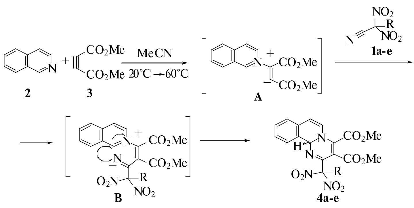 Ранее были исследованы реакции замещенных (тринитро-, этилдинитро- и галогендинитроацетонитрилов) с алифатическими диазосоединениями, N-оксидами нитрилов, которые в зависимости от природы полинитрометанов завершились получением целого ряда конечных продуктов: 4-динитрометил-1,2,3-триазолов, N-оксида 3-нитроизоксазолина, 1-галоген-2,2,2-тринитроэтана, нитроалкенов и 5-динитрометил-1,2,4-оксадиазолов [1–5]. Этими реакциями ограничиваются сведения о полинитрометильных соединениях с 1,3 — диполями. Таким образом, изучение синтетического потенциала реакций замещенных динитроацетонитрилов представляется весьма актуальной задачей. Цель исследования изучение взаимодействия полинитрометанов 1а-е с 1,3 — диполем полученным из изохинолина 2 в присутствии диметилового эфира ацетилендикарбоновой кислоты 3.Установлено, что реакция трехкомпонентной гетероциклизации полинитрометанов 1a–e с изохинолином 2 и реагентом 3 в среде осушенного ацетонитрила завершается образованием ранее неизвестных аддуктов — замещенных диметил-2-динитрометил-11вН-пиримидо[2,1-а]изохинолин-3,4-дикарбоксилатов 4a–e c выходом 52–65% (схема). Дополнительно из реакционной смеси выделены неидентифицированные смолообразные вещества с выходом 22–24%.