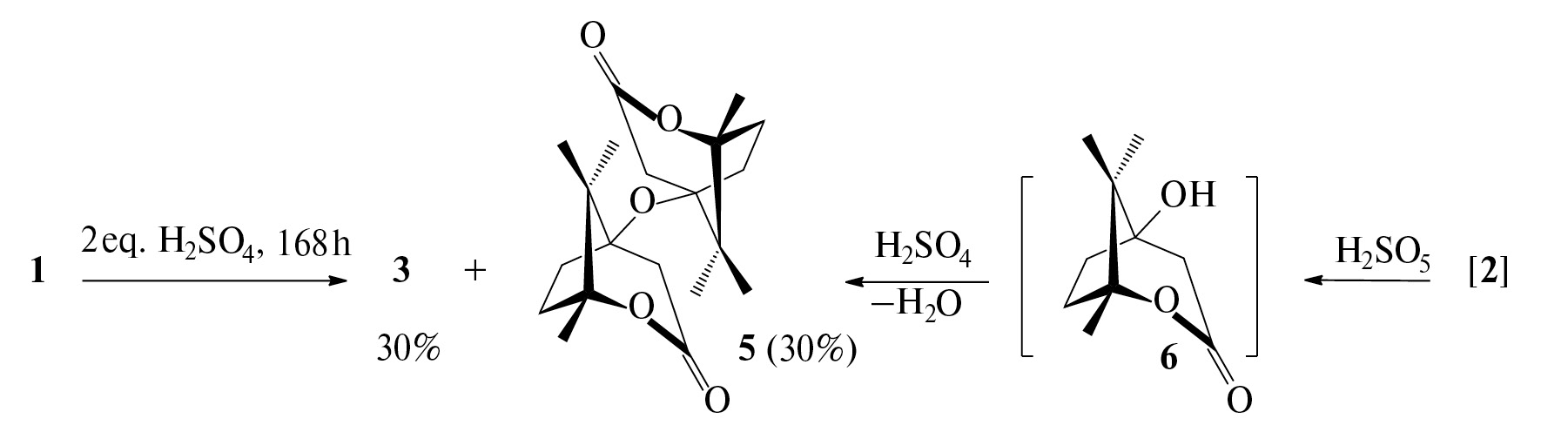 Ранее нами установлено [16], что обработка R-(+)-камфоры (1) 2 экв. кислоты Каро при комнатной температуре в течение 7 суток протекала с образованием α-камфолида 3 и оксибислактона 5, вероятно, образующегося из третичного спирта 6 — продукта окисления того же β-камфолида 2 по С5 положению (схема 3).