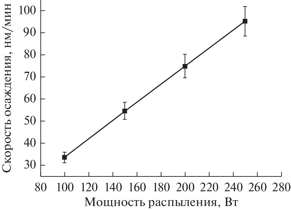 Magnetron sputtering in the medium frequency (MF) mode was used to obtain ITO films on glass substrates at room temperature in an oxygen-free environment. The effect of the magnetron sputtering power on the electrophysical properties and surface morphology of ITO films is studied. It is shown that the ITO film deposition rate depends linearly on the power of magnetron sputtering in the MF mode. It is found that ITO films have a predominantly nanocrystalline structure at a magnetron sputtering power of more than 100 W. Increasing the sputtering power leads to an increase in surface roughness from 13.5 to 24.6 nm and grain size from 11.7 to 27.5 nm in the ITO film. The minimum resistivity of the ITO films is 6.82 × 10–4 Ω cm at the concentration and mobility of charge carriers of 2.48 × 1020 cm–3 and 36.8 cm2/V s, which corresponds to the optimum power of magnetron sputtering of 200 W. The results obtained correspond to a high level of surface resistance values for ITO films (34.1 Ω/□), which can be used to form transparent conducting electrodes in solar cells and memristors, both on glass and flexible substrates.