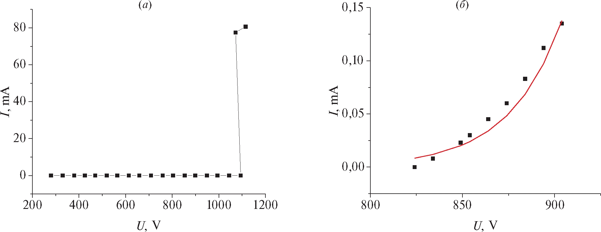 В ходе проведения исследований было обнаружено, что при токовой активации происходит пробой вакуумного промежутка с возникновением дугового разряда. Это явление можно наблюдать при первом измерении ВАХ (см. рис. 1, а), когда по мере увеличения напряжения анодный ток отсутствует, а при некотором критическом напряжении происходит мгновенное возникновение экстремально высокого первоначального тока со значениями, которые впоследствии не достигаются при нормальном режиме функционирования. В момент первоначального возникновения пробойного тока в месте расположения анода отмечались небольшие вспышки света. При этом имело место падение напряжения, что характерно для дугового разряда, для которого также свойственны высокая плотность тока и высокая концентрация заряженных частиц в прикатодной области, что и выразилось в мгновенном возникновении тока.