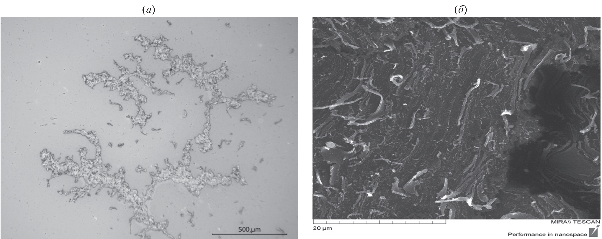 Рис. 3. Оптическая микроскопия области первоначального пробоя (а) и электронная микроскопия участка первоначального пробоя с фокусировкой на поверхностных образованиях (б). Образец с сопротивлением 230 кОм.