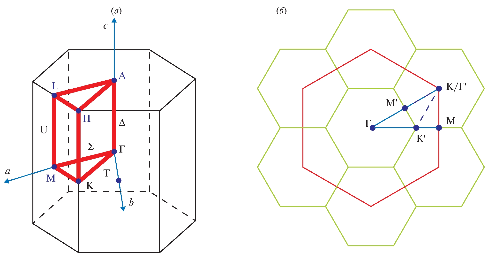 Рис. 1. Схема зоны Бриллюэна (ZB) гексагонального политипа 4H–SiC (а) и ZB элементарной ячейки 4H–SiC (б).