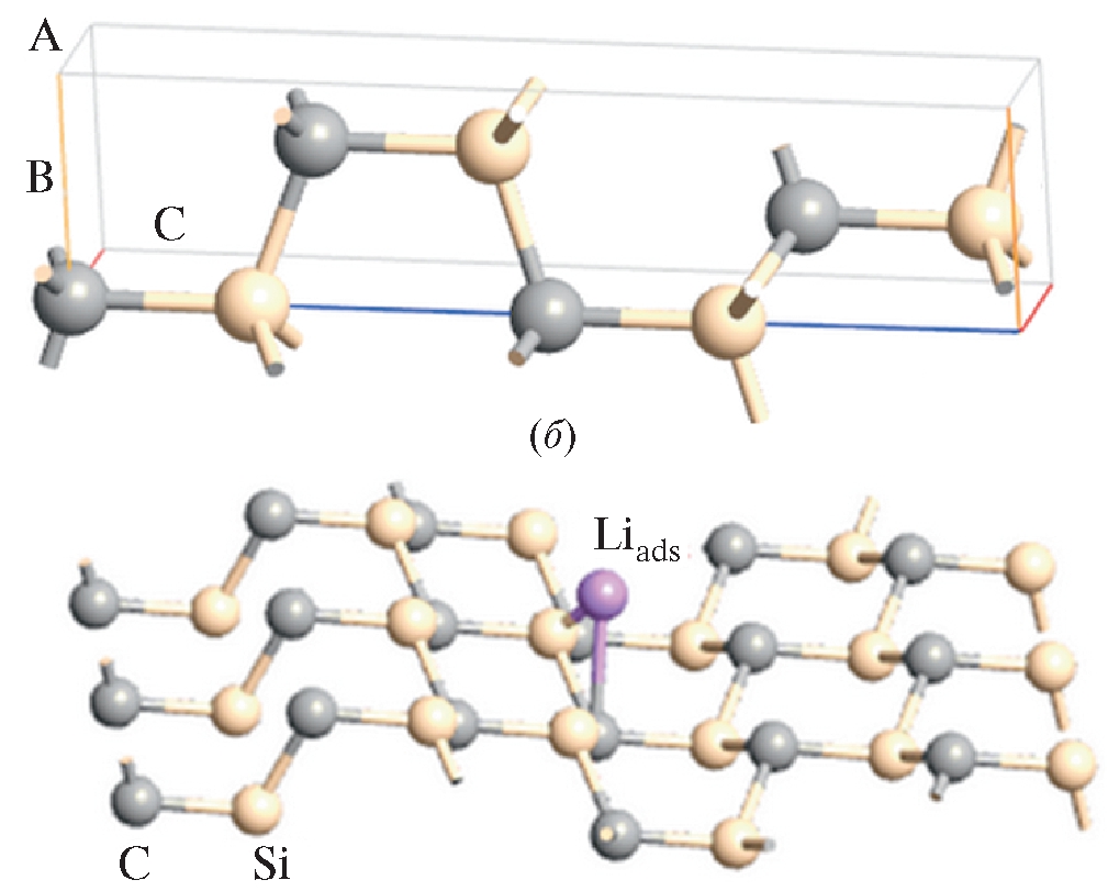 Структурные, адсорбционные, электронные и термодинамические свойства бинарных соединений AmBn системы Si–C–Li рассчитаны методом теории функционала плотности (DFT) с использованием программы ATK [33, 34]. Обменно-корреляционные эффекты рассчитаны в рамках обобщенного градиентного приближения (GGA PBE) [35]. DFT GGA PBE расчеты полных энергий 2 × 2 × 1 и 3 × 3 × 1 суперъячеек соединений проводили на предварительно релаксированных ячейках. Расчеты проводили разложением волновых функций в базисном наборе в виде плоских волн с использованием соответствующих “суперъячеек”. Количество плоских волн определяли обрезанием кинетической энергии с учетом валентных электронов атомов (Si–[Ne]3s²3p², C–[He]2s22p2, Li–[He]2s1) в основном состоянии. Кинетическая энергия отсечки в разложении псевдоволновых функций выбиралась от 450 до 500 эВ. Допуски сходимости при DFT GGA PBE оптимизации постоянных кристаллических решеток соединений системы Si–C–Li для энергии обрезания составляли 10–5 эВ/атом. А для изменения электрической силы, действующей на ядра молекул в веществе, допуски сходимости были 0.03 эВ/Å.