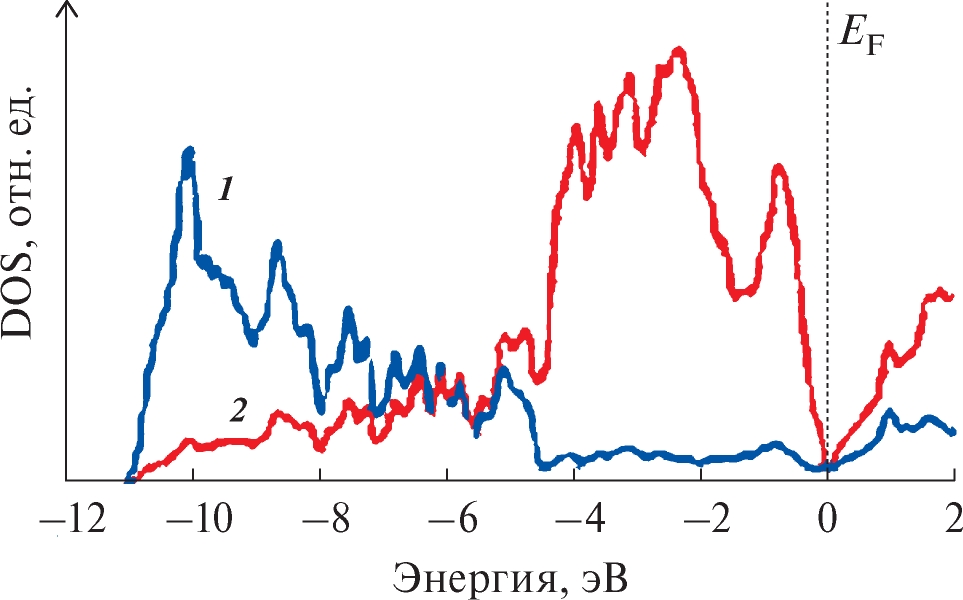 Парциальные вклады PDOS орбиталей как лития, так и углерода формируют плотность состояний атомов в широкозонном α-Li2C2 = 3.2 эВ). Спектр PDOS α-Li2C2 характеризуется пиками гибридизированных атомных орбиталей углерода C2s-2p (sp1), где C2s-состояния соответствуют в основном отрицательным энергиям. Углеродные 2p-состояния располагаются вблизи уровня Ферми. В α-Li2C2 спин вверх и спин вниз состояния DOS симметричны и локальный магнитный момент не обнаружен. В полном DOS соединения LiSi очень узкая запрещенная зона не обнаруживается, хотя по экспериментальным данным LiSi имеет запрещенную зону 0.057 эВ. Отсутствие Eg в LiSi связано с s-p-гибридизацией, приводящей к тетраэдрической структуре sp3. Энергии 1s22s1 состояний лития в спектре DOS LiSi незначительные. Присутствие Li в фазе LiSi снижает степень s-p-гибридизации.