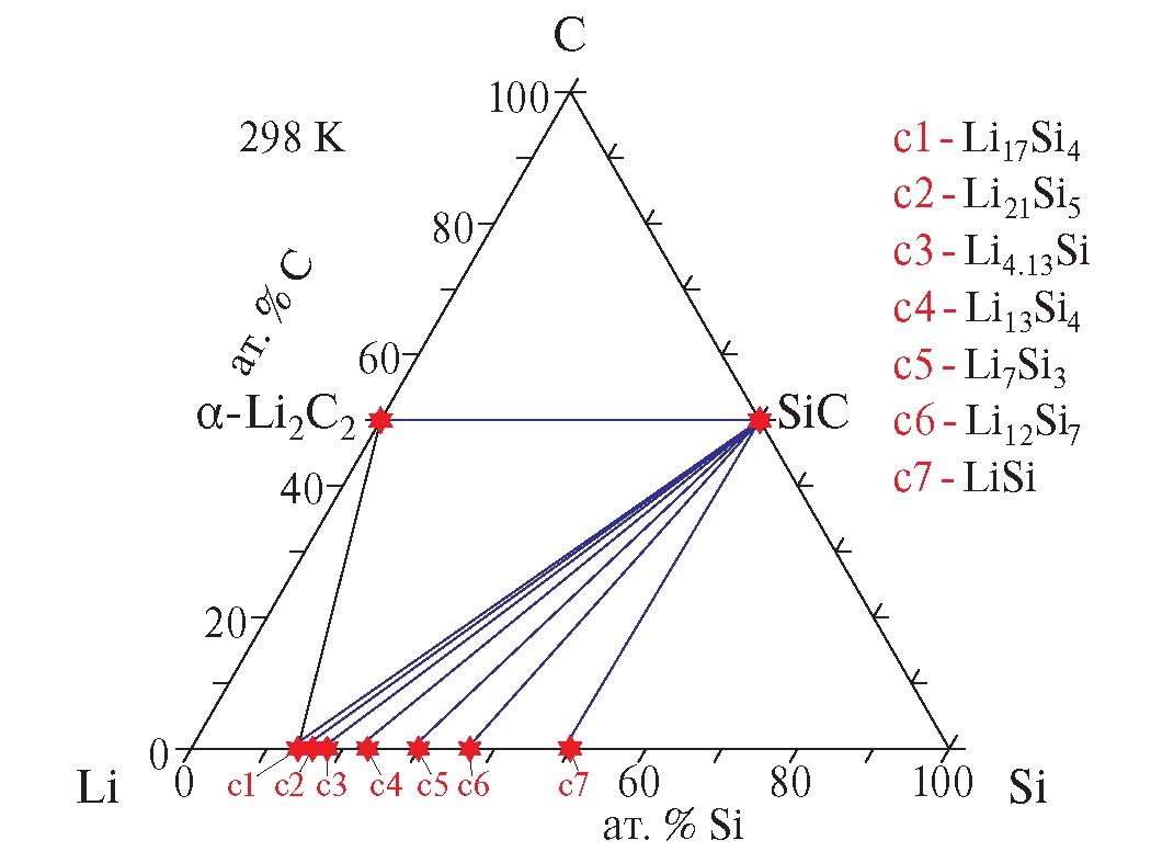 Система Si–C–Li. Фазовая диаграмма и термодинамические свойства сплавов тройной системы Si–C–Li изучены в работе [6]. Приведены результаты экспериментов по отжигу сплавов Si–C–Li и дифференциальной сканирующей калориметрии. Установлены области трехфазных равновесий при 903–923 К. Проведено термодинамическое описание тройной системы Si–C–Li с учетом данных по двойным граничным системам Si–Li, C–Li и Si–C. Растворимость Li в соединениях систем Li–C, Li–Si, а также в SiC в твердом состоянии незначительна [5–7]. Термодинамическим методом рассчитаны отдельные участки фазовой диаграммы Si–C–Li [5, 6].