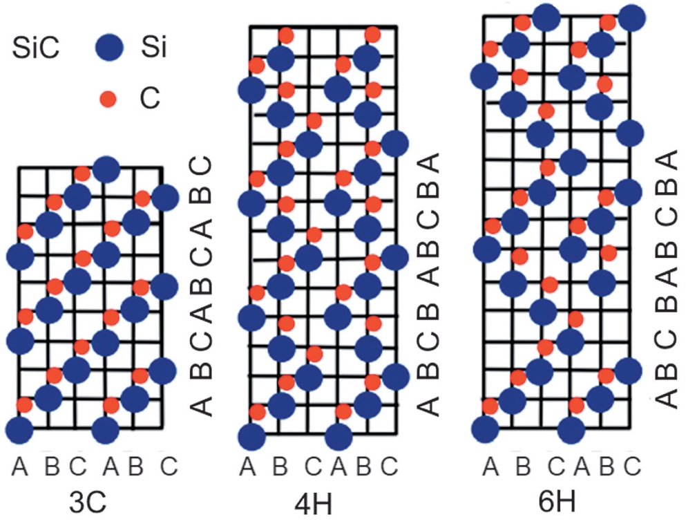 Энергия образования химических соединений, в частности 2D Si1 − xCx, их молекулярная конфигурация, структура, стабильность и свойства сильно зависят от атомного соотношения компонентов, а также от концентрации и природы примесей и/или легирующих компонентов. Помимо вышеупомянутых проблем известно, что Si–С существует в более чем 250 политипах. В частности, кубическая 3C и гексагональные политипы 2H–, 4H–, 6H–SiC соответствуют разному расположению атомов (или стекингу) по схемам AB, ABCА, ABCB и/или ABCACB. Во всех политипах SiС имеются связи Si–Si и C–C; каждый Si окружен 4 атомами углерода, и наоборот, каждый атом углерода C связан с 4 атомами Si (рис. 14).