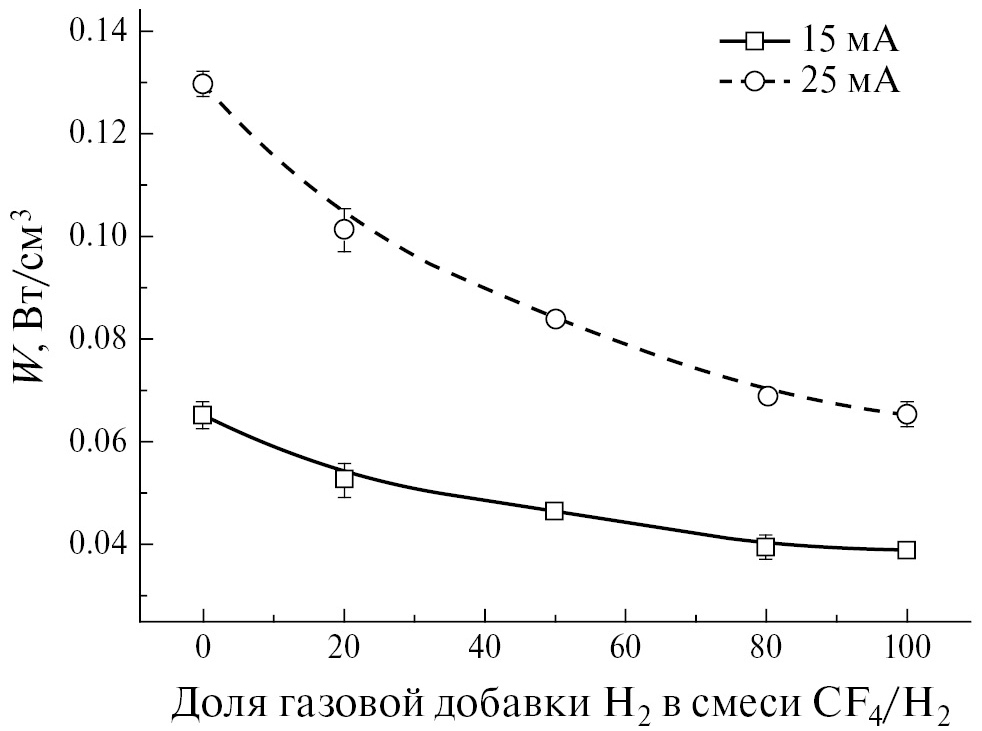 На рис. 3 показаны зависимости приведенной напряженности электрического поля E / N от доли водорода в смеси с тетрафторметаном для 15 и 25 мА. Из приведенных зависимостей видно, что напряженность электрического поля также плавно уменьшается от значения, соответствующего тетрафторметану, до значения, соответствующего чистому водороду, при этом характер зависимостей близок к линейному (в 1.7 раза для i = 15 мА и в 2.1 раза i = 25 мА). В плазме CF4 параметр величины приведенной напряженности поля является высоким из-за эффективного расходования электронов на процессы диссоциативного прилипания с молекулами тетрафторметана [14, 15]. При условии постоянства тока разряда рост доли водорода в смеси с тетрафторметаном приводит к уменьшению концентрации отрицательных ионов, росту концентрации электронов и, как следствие, к падению параметра E / N вследствие изменения режима диффузии электронов от свободного к амбиполярному при уменьшении электроотрицательности плазмы.